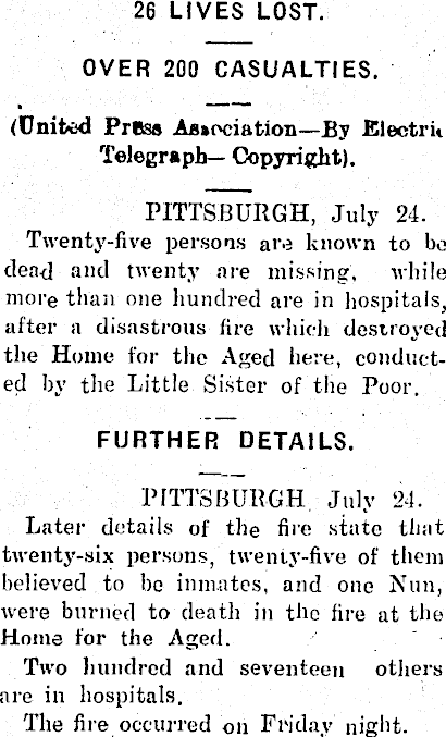 26 LIVES LOST. OVER 200 CASUALTIES. (United Prßsa Aa»ociation—By Electrii Telegraph— Copyright). PITTSBURGH, July 24. Twenty-five persons are known to bo dead and twenty are missing, while more than one hundred are in hospitals, after a disastrous fire which destroyed the Home for the Aged here, conducted by the Little Sister of the Poor. FURTHER DETAILS. PITTSBURGH. July 24. Later details of the fire state that twenty-six persons, twenty-five of them believed to be inmates, and one Nun, were burned to death in the fire at the Home for the Aged. Two hundred and seventeen others are in hospitals. The fire occurred on Friday night.