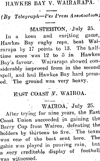 HAWKES BAY V. WAIRARAPA. (By Telegraph —Pei Press Association) MASTERITON, July 25. In a keen aud exciting game, Hawkes Bay rugby reps, beat Wairarapa by 17 points to 13. The (halftime score was 12 to 5 in Hawkes Bay’s favour. Waiirarapa showed considerably improved from in the second spell, and had Hawkes Bay hard pressed. The ground was very heavy. EAST COAST jV- WAIROA. WAIROA/ July 25. After t lying for nine years, the East Coast Union succeeded in gaining the Barry Cup from Waiiroa, defeating the holders by thirteen to five. Hie team was one of the best sent heie. The gahie was played in pouring rain, but a very creditable display of football was witnessed.