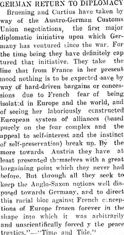 GERMAN RETURN TO DIPLOMACY Bruening and Gurtius have taken by way of the Austro-Germaii Customs Union negotiations, tlie first major diplomatic initiative upon which Germany has ventured since the war. For the time being they have definitely cap tured that initiative. They take the line that from France in her present mood nothing is to be expected save by way df hard-driven bargains or concessions due to French fear of being isolated in Europe and the world, and of seeing her laboriously constructed. European system of alliances (based purely on the fear complex and the appeal to self-interest and the instinct of self-preservation) break up. By the more towards Austria they have at least presented themselves with a great bargaining point which they never had before. But through all they seek to keep the Anglo-Saxon notions well disposed towards Germany, and to direct this racial bloc against French conceptions of Europe frozen forever in the shape into which it was arbitrarily and unscientifically forced v the peace treaties.”—“Time and Tide.”