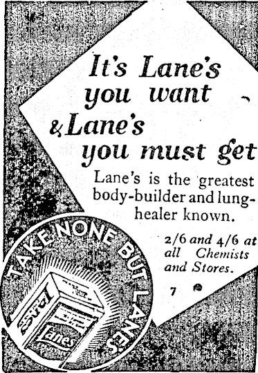 mm Its Lanes you want > ii Lanes you must gfet Lane’s is the greatest body-builder and lunghealer known. 2/6 and 4/6 at all Chemists and Stores. 7