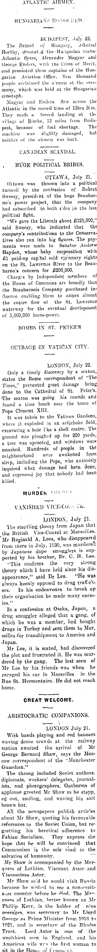 ATLANTIC AIRMEN. HUNGARIAN',- I P ill: ED BUD.AI’KST, July 22. The Regent of Hungary, Admiral Hoi'thy, decorate) the Hungarian tnUisAllantic flyers, Alexander Magyar and George Enders, with the Cross of Merit, and promoted them captains of the Hungarian Aviation Office. Ten thousand people acclaimed the a’rmen at the ceremony, which was held at the Hungarian cenotaph. .Magyar and Knders flew across the Atlantic in the record time of 13hrs 5Cm. They made a forced landing at the village of Biscke, 12 miles from Budapest, because of fuel shortage. The machine was slightly damaged, but neither of the airmen was hurt. CANADIAN SCANDAL. HUGE POLITICAL BRIBES. OTTAWA, July 21. Ottawa was thrown into a political turmoil by the confession of Robert ■Sweezy, president of the huge Beauhavno’s power project, that the company had subscribed to both sides in the last political fight. “We gave the Liberals £125,000," said Sweezy, who indicated that the company's contributions to the Conservatives also ran into big figures. The payments were made to Senator -Andrew •Haydon, whose baby corporation with £1 paid-up capital sold vjs’onary rights on the St. Lawrence River to t)ie Beauharno's concern for £200,000, Charges by independent members of the House of Commons are broadly that the Beauharnois Company purchased influence enabling them to annex almost the entire- flow of the St. Lawrence waterway for the eventual development of 3,000,000 horse-power. BOMBS IN ST. PETER'S OUTRAGE 'IN VATICAN CITY. LONDON, July 22. Only a timely discovery by a sexton, states the Rome correspondent of "The Times,” prevented great damage being done to the Cathedral of 'St. Peter’s. The sexton was going his rounds and found a time bomb near the torno of Pope Clement XIII. It was taken to the Vatican Gardens, where it exploded in an artichoke field, ■excavating a hole like a shell crater. The ground was ploughed up for 200 yards, a tree was uprooted, and windows were smashed. Hundreds of people in the neighbourhood were awakened from sleep, including the Pope, who anxiously inquired what damage had been done, and expressed joy that nobody had been killed. MURDEh cs-fiiiY VANISHED YKE-CG. UL. LONDON, July 21. The startling tlieoi-y from Japan that the British Vice-Consul at Marseii.es, ’Mr Reginald A, Lees, who disappeared from there in July, 1930, was murdered by Japanese dope smugglers is .supported by bis brother, Dr. C. H. Lee. “This confirms the very strong theory which 1 have held since his disappearance,” said Dr Leo. "He was always keenly opposed to drug traffickers. In his endeavours to break up their organisation he made many enemies.” In n confession at Osaka, Japan, a drug smuggler alleged that ft gang, of which ho was a member, had bought drugs in Turkey and sent them to Mar. seilles Tor transhipment to America and Japan. Mr Lee, it is stated, had discovered the plot and frustrated it. He was murdered by the gang. The last seen of Mr Lee by his friends was when he garaged his car in Marseilles in the Rue St. Hermcntaire. He did not reach home. CREAT WELCOME. ARISTOCRATIC COMPANIONS. LONDON July 21. With bands playing and red banners waving dense crowds at the railway station awaited the arrival of Mr George Bernard Shaw, says the Moscow correspondent of the “Manchester Guardian.” The throng included Soviet authors, diplomats, workers’ delegates, journalists, and photographers. Outbursts of applause greeted Mr Shaw as he stepped out, smiling, and waving his soft brown hat. All the newspapers publish artie'es about Mr Shaw, quoting his favourable references to the Soviet Union, but regretting his heretical adherence to Fabian .Socialism, They express the hope that he will be convinced that Communism is the sole road to the salvation of humanity. Mr Shaw is accompanied by the Marquess of Lothian, Viscount Astor and Viscountess Astor. Mr Shaw sad he would visit Russia because he wished to see a non-capit-a.ist country before be died. The Me" oneo.s of I.othian, better known ns Mr Phillip Kerr, is the holder of nine ueerages. was secretary' to Mr Lloyd Genrce as Prime Minister from 1916 to 1921, and is secretarv of the Rhodes Trust. Lord Astor is one of the Wealthiest men in England, and his American wife wrs flip first woman to sit in the Horn*.- of ( omm. us.