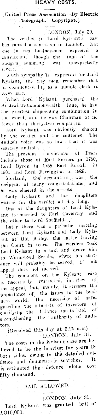 HEAVY COSTS. [United Press Association—By Electric 'telegraph.—Copyright.] LONDON, July 30. The verdict in Lord Kylsant s case has caused a sensat.on in London. -Not one in ten businessmen expecud a convict.on, though the tone of the uiiUges suinm.ug was unexpectedly severe. .\iuch sympathy is expressed for Lord hy.daiii, ilio c.ty men remember Unit in: cu.umeiu-.d l.i- as a humble clerk at .Newcastle. Mima Lord Kylsant purchased the Au:-.iraiiiin-t.onimoiiW'.alth lane, he haci the greatest shipowamg combinat.on in the world, and he was Chairman of no fower than thafy-two companies. l.oid lvyisant was obviousiy shaken by the vent.cl and the sentence. The Judge’s voice’ was so low that it was scarcely audible. The previous convictions of Peers include those of Earl Ferrers in 1760, Lord Byron in 1(65 Karl Russell in 1901 and Lord Ferrington in 1928. Morland, the' accountant, was the recipient of many congratulations, and he was cheered in the streets. Lady Kylsant and her daughters waited for the verdict all day long. Une of the daughters of Lord Kylsant is married to Jsarl Coventry, and the other to Lord Sheffield. , Later there was a pathetic meeting between Lord Kylsant and Lady Kylsant at Old Bailey, the latter leaving the Court in tears. The warders took Lord Kylsant in a taxi and drove him to Wormwood Scrubs, where his sentence will probably be seiietl, if his appeal does not succeed. The comment on the Kylsant case is necessarily restricted, in view of the appeal, but, mainly, it stresses the importance of the issues to the business world. the necessity of saleguarding the interests of investors ol clarifying the balance sheets and ot strengthening the authority of auditors. (Received this day at 9.-i-> a.in) LONDON, July 31. The costs in the Kylsant case are believed to be the heaviset for years by both sides, owing to the detailed evidence and dcumentniy searches. It is estimated the defence alone cost fifty thousand. bail allowed. LONDON, July 31. Lord Kylsant was granted bail of CQIO,OOO.