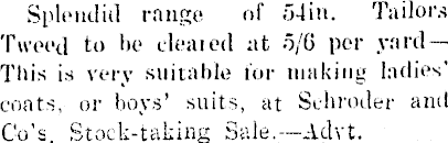 Splendid range ol .54in. Tailors Tweed to he denied at 5/6 per yard This is very suitable for making ladies' coats, or boys’ suits, at Schroder and Co’s. Stock-taking Sale.---Advt.