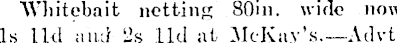 Whitebait netting 80in. wide now Is lid and 2s lid at McKay’s.—Advt.