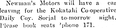 Newman’s Motors will have a ear leaving for the Kokatahi Co-operative Daily Coy. Social to-morroW night, I'lease hook seats ’phone 171.
