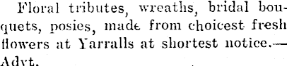 Floral tributes, wreaths, bridal bouquets, posies made from choicest fresh flowers at Yarralls at shortest notice.— Advt.