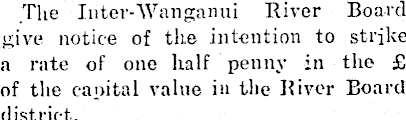 The Inter-Wanganui Iliver Board give notice of the intention to strike a rate of one half penny in the £ of the capital value in the River Board district.