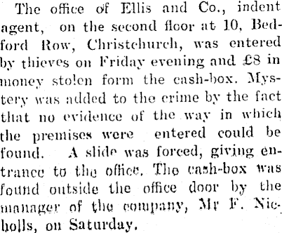 The office of Ellis and Co., indent, agent, on the second floor at 10, Bedford Row, Christchurch, was entered by thieves on Friday evening and £8 in money stolen form the cash-box. Mystery was added to the crime by the fact that no evidence of the way in which the premises were entered could be found. A slide was forced, giving entrance to tlie office. The wish-box ivns found outside the office door by the manager of the company, Mr I*. Nio Uolls, on Saturday,