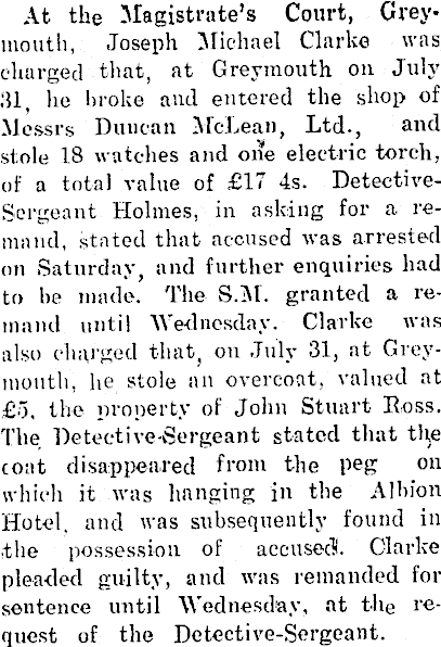 At the Magistrate’s Court, Greymouth, Joseph Michael Clarke was charged that, at Greymouth on July 81, lie broke and entered the shop of Messrs Duncan McLean, Ltd., and stole 18 watches and one electric torch, of a total value of £l7 4s. DetectiveSergeant Holmes, in asking for a remand, stated that accused was arrested on Saturday, and further enquiries had to be made. The S.M. granted a remand until Wednesday. Clarke was also charged that, on July 31, at Greymouth, he stole an overcoat, valued at £5, the property of John Stuart Loss. The Detective-Sergeant stated that the coat disappeared from the peg on which it was hanging in the Albion Hotel, and was subsequently found in •the possession of accused. Clarke pleaded guilty, and was remanded for sentence until Wednesday, at the request of the Detective-Sergeant.