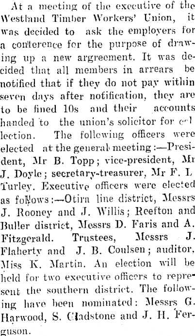 At a meeting of tin? executive of the Westland Timber Workers’ Union, it was decided to ask the employers for a conference for the purpose of drawing up a new argreement. It was decided that all members in arrears be notified that if they do not pay within seven days after notification, they are to be fined 10s and their accounts handed to the union’s solicitor for c' l lection. The following officers were elected at the general meeting :—President, Mr B. Topp; vice-president, Mr J. Doyle; secretary-treasurer, Mr F. L Turley, Executive officers were elected as follows Otira line district, Messrs J. Rooney and J. Willis; Reef ton and Buller district, Messrs D. Paris and A. Fitzgerald. Trustees, Messrs J. Flaherty and J. B. Coulsen ; auditor. Miss K. Ma i’tin. An election will be held for two executive officers to represent; the southern district. The following have been nominated: Messrs G. Harwood, S. Gladstone and J. 11. Ferguson.