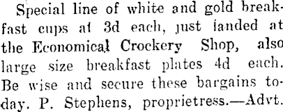 Special line of white and gold breakfast cups al 3d each, just iaiuled at the Economical Crockery Shop, also large size breakfast plates 4d each. Be wise and secure these bargains today. P. Stephens, proprietress.—Advt.