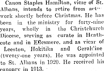 Canon Staples Hamilton, vicar of St. Albans, intends to retire from act” work shortly before Christmas. He has been in the ministry for forty-nine years, wholly in the Christchurch Diocese, serving as curate in Heatli-cot-e and in Ellesmere, and as vicar of Leeston, Hokitika and Geraldine (twenty-one years). He was appointed to St. Albans in 1920. He received his canonry in 1913.
