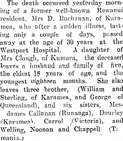 The death occurred yesterday morning of a former well-known Rewanui resident, Mrs D. Buchanan, of Karamea, who .after a sudden illness, lasting only a couple of days, passed away at the age of 39 years at the Westport Hospital. A daughter Of Mrs Clough, of Kutmira, the deceased leaves a husband auci family of five, the eldest 18 years of age, and the youngest eighteen months. She also leaves three brother, (William and Sterling, of Ivaramea, and George of Queensland), and six sisters, Mesdames Callanan (Runanga), Dourley (TvnrameaV Carrol /Victoria), and Welling, Noonan and Chappell (T: mania.;