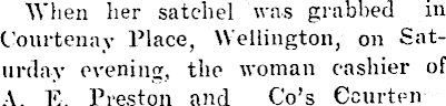 When her satchel was grabbed in Courtenay Place, Wellington, on Saturday evening, the woman cashier of A. E. Preston and Co’s Ccurten