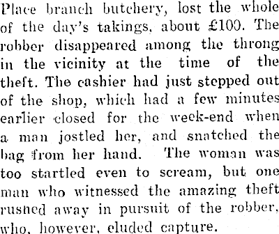 Place branch butchery, lost the whole of the day’s takings, about £IOO. The robber disappeared among the throng in the vicinity at the time of the theft. The cashier had just stepped out of the shop, which had a few minutes earlier closed for the week-end when a man jostled her, and snatched the bag from her hand. The woman was too startled even to scream, but one man who witnessed the amazing theft rushed away in pursuit of the robber, who, however, eluded capture.