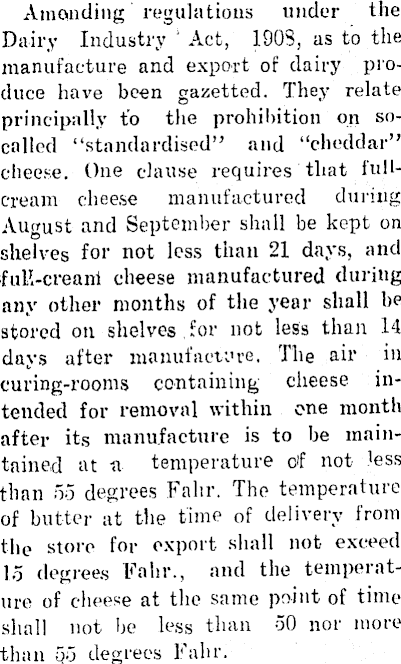 Amending regulations under the Dairy Industry Act, 1903, as to the manufacture and export of dairy produce have been gazetted. They relate principally to the prohibition on socalled “standardised” and “cheddar” cheese. One clause requires that fullcream cheese manufactured during August and September shall be kept on shelves for not less than 21 days, and full-cream cheese manufactured dining any other months of the year shall be stored on shelves for not less than 14 days after manufacture. The air in curing-rooms containing cheese intended for removal within one month after its manufacture is to be maintained at a temperature cf not less than 55 degrees Falir. The temperature of butter at the time of delivery from flic store for export shall not exceed 15 degrees Falir., and the temperature of cheese at the same point of time shall not be less than 50 nor more than 55 degrees Falir.