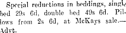 Special reductions in beddings, single bed 29s 6d, double bed 49s 6d. Pillows from 2s 6d, at McKays sale \dvt.