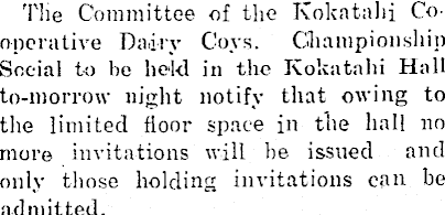 The Committee of the Kokatahi Cooperative Dairy Coys. Championship Social to be held in the Kokatahi Hall to-morrow night notify that owing to the limited floor space in the hall no more invitations will he issued and only those holding invitations can be admitted.