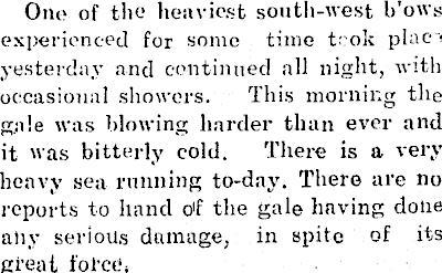 One of the heaviest south-west b’ows experienced for some time took plac-v yesterday and continued all night, with occasional showers. This morning the gale was blowing harder than ever and it was bitterly cold. There is a very heavy sea running to-day. There are no reports to hand of the gale having done ally serious damage, in spite of its great force.