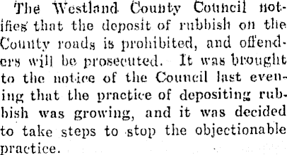 Thu Westland County Cotihcil notifies’ that the deposit of rubbish oil the CoUUty roads is prohibited, and offenders will be prosecuted. It was brought to the notice of the Council last evening that the practice of depositing rubbish was growing, and it was decided to take steps to stop the objectionable practice.