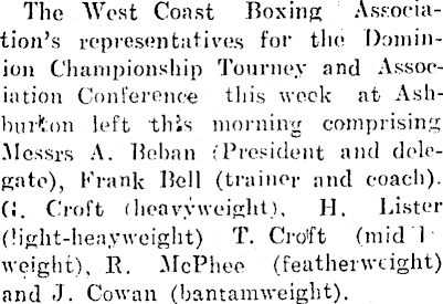 The West Coast Boxing Association’s representatives for the Dominion Championship Tourney and Association Conference this week at Ashburton left this morning comprising Messrs A. Behan (President and delegate), Frank Pell (trainer and coach). (!. Croft (heavyweight), 11, Lister (light-heayweight) T. Croft (mid 1 weight), R. McPhee (featherweight) and J. Cowan (bantamweight).