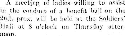 A meeting of ladies willing to assist in the conduct of a benefit ball on the -nd. pros, will be held at the Soldiers’ Hall at 3 o’clock on Thursday afternoon.