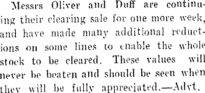 Messrs Oliver and Duff are continuing their clearing sale for one more week, and have made many additional reductions on some lines to enable the whole stock to be cleared. These values will never be beaten and should be seen when they will be fully appreciated.—Advt.