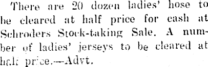 There are 20 dozen ladies’ hose to he cleared at half price for cash at Schroders Stock-taking Sale. A number of ladies’ jerseys to be cleared at lif.l; price,—Advt.