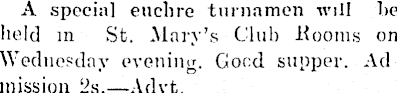 A special euchre turnamen will be held m St. Mary’s Club Rooms on Wednesday evening. Good supper. Ad mission 2s.—Advt.