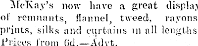 McKay's now have a great display of remnants, flannel, tweed, rayons, prints, silks and curtains m all lengths. Prices from Gd.—Advt.