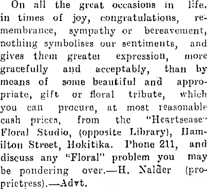 On all the great occasions m life, in times of joy, congratulations, remembrance, sympathy or bereavement, nothing symbolises our sentiments, and gives them gl-eatei expression, more gracefully and acceptably, than by means of some beautiful and appropriate, gift or floral tribute, which you call procure, at most reasonable ensh prices, from the "Heartsease" Floral Studio, (opposite Library), Hamilton Street, Hokitika. Phone 211, and discuss any "Floral” problem you may be pondering over.—H. Naldcr (proprietress).—Advt.