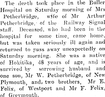 The death took place in the Buller Hospital on Saturday morning of Airs PetlierlVridge, wife of Air Arthur Potherbridge. of the Railway Signal staff. Deceased, who bad been in the hospital for some time, came home, but was taken seriously ill again and returned to pass away unexpectedly on Saturday morning. She was a native of Hokitika, 48 years of age. and is survived by sorrowing husband and one son, Air AV. Petherbridge, of New Plymouth, ami, two brothers, Air K. Felix, of Westport and Air F. Felix, of Grevmouth.