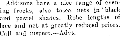Addisons have a nice range of evening frocks, also tosca nets in black a.nd pastel shades. Robe lengths of lace and net at greatly reduced prices. Call and inspect.—Advt.