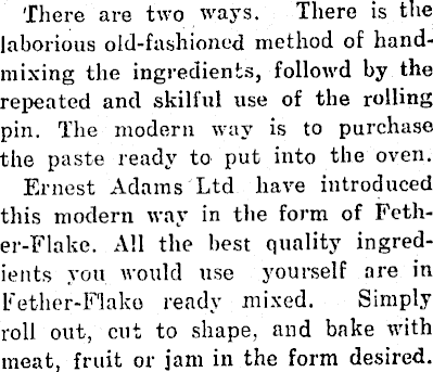 There are two ways. There is the laborious old-fashioned method of handmixing the ingredients, followd by the repeated and skilful use of the rolling pin. The modern way is to purchase the paste ready to put into the oven. Ernest Adams Ltd have introduced this modern way in the form of Feth-er-Flake. All the best quality ingredients you would use yourself are in Fether-Flako ready mixed. Simply roll out, cut to shape, and bake with meat, fruit or jam in the form desired.