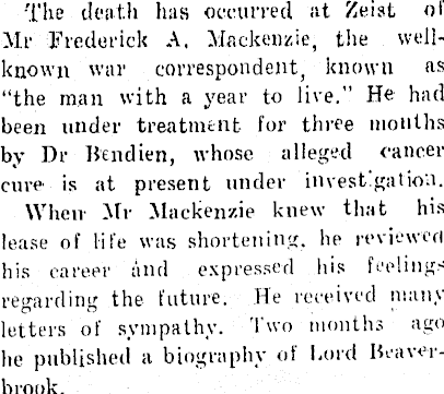The death has occurred at Zeist of Mr Frederick A. Mackenzie, the wellknown war correspondent, known as “the man with a year to live.” He had been under treatment for three months by Dr Bendien, whose alleged cancer cure is at present under invest.gation. When- Mr Mackenzie knew that his lease of life was shortening, he reviewed his career and expressed his feelings regarding the future. He received many letters of sympathy. Two months ago lie published a biography of Lord Beaverbrook.