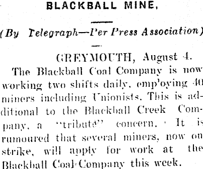 BLACKBALL MINE, (By Telegraph —Ver Press Association) GRFY.MOUTH, August 4. The Blackball Coal Company is now working two shifts daily, emp’oying 41 > miners including Unionists. This is additional to the Blackball Creek Company, a "tributW concern. 1 It is rumoured that several miners, now on strike, will apply lor work at the Blackball CoaL Company this week.