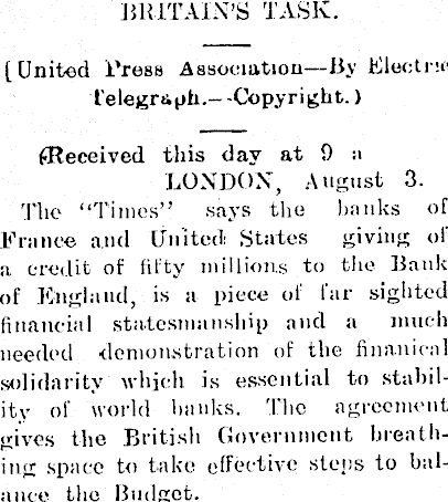 BRITAIN’S TASK. (United Press Association —By Electric Telegraph.--Copyright.) (Received this day at 0 a LONDON, August 3. The “Times” says the banks of France and United: States giving of a credit of fifty millions to the Bank of England, is a piece ol far sighted financial statesmanship and a much needed demonstration of tbe finanicnl solidarity which is essential to stability of world banks. The agreement gives tbe British Government breathing space to take effective steps 1° balance the Budget.