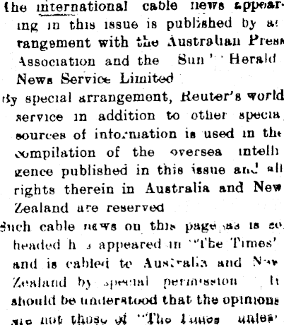 Ihe international cable news appearing in this issue is published by at rangsment with the Australian Pres* \ssociation and the Sun ’ ' Herald News Service Limited tty special arrangement, Heuter’s world service in addition to other specia sources of information is used in tht v'ompilation of the oversea intelli nence published in this issue anJ “II rights therein in Australia and New Zealand are reserved Such cable news on this page as is so headed h j appeared in ‘The Times’ and is cabled to and N Zealand by .»peeml perm's slim It should he understood that the opinions .HC nut tftOSv s 4 "The i*4MO9 UUIeV