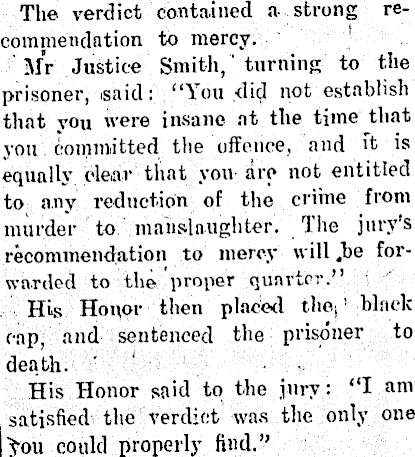 The verdict contained a strong recommendation to mercy. 'mV Justice Smith,' turning to the prisoner, .said: “You did not establish that you were insane at the time that you committed the offence, and it is equally clear that you are not entitled to any reduction of the crime from murder to manslaughter. The jury’s recommendation to mercy will _be forwarded to the proper quarter.” His Honor then placed the.; black cap, and sentenced the prisoner to death. His Honor said to the jury: “I am satisfied the verdict was the only one >oii could properly find.”