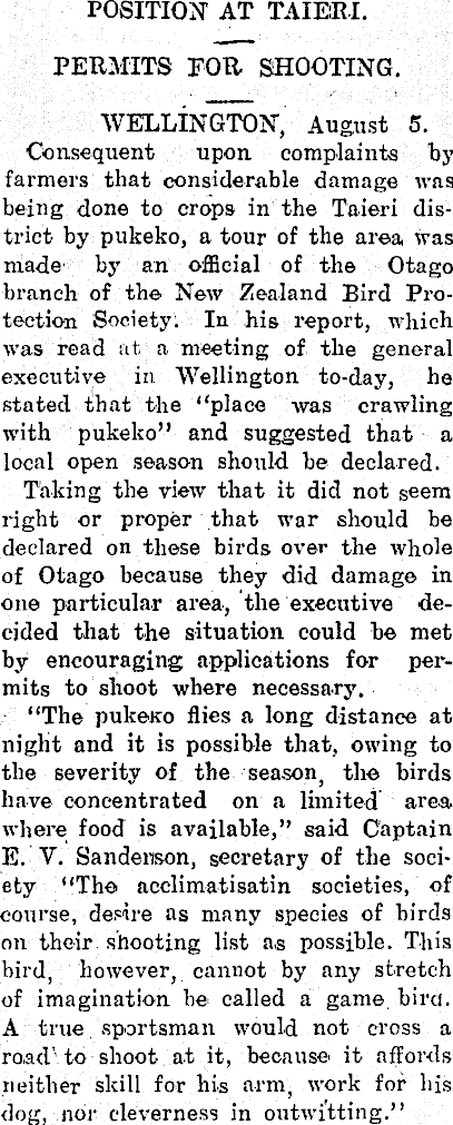 POSITION AT TAIERI. PERMITS FOR SHOOTING. WELLINGTON, August 5. Consequent upon complaints by farmers that considerable damage was being done to crops in the Taieri district by pukeko, a tour of the area was made by an official of the Otago branch of the New Zealand Bird Protection Society. In his report, which was read at a meeting of the general executive in Wellington to-day, he stated that the “place was crawling with pukeko” and suggested that a local open season should be declared. Taking the view that it did not seem right or proper that war should be declared on these birds over the whole of Otago because they did damage in one particular area, the executive decided that the situation could be met by encouraging applications for permits to shoot where necessary. “The pukexo flies a long distance at night and it is possible that, owing to the severity of the season, the birds have concentrated on a limited area where food is available,” said Captain E. V. Sanderson, secretary of the society “The acclimatisatin societies, of course, desire as many species of birds on their shooting list as possible. This bird, however, cannot by any stretch of imagination be called a game bird. A true sportsman would not cross a road’ to shoot at it, because it affords neither skill for his arm, work for his dog, nor cleverness in outwitting.”
