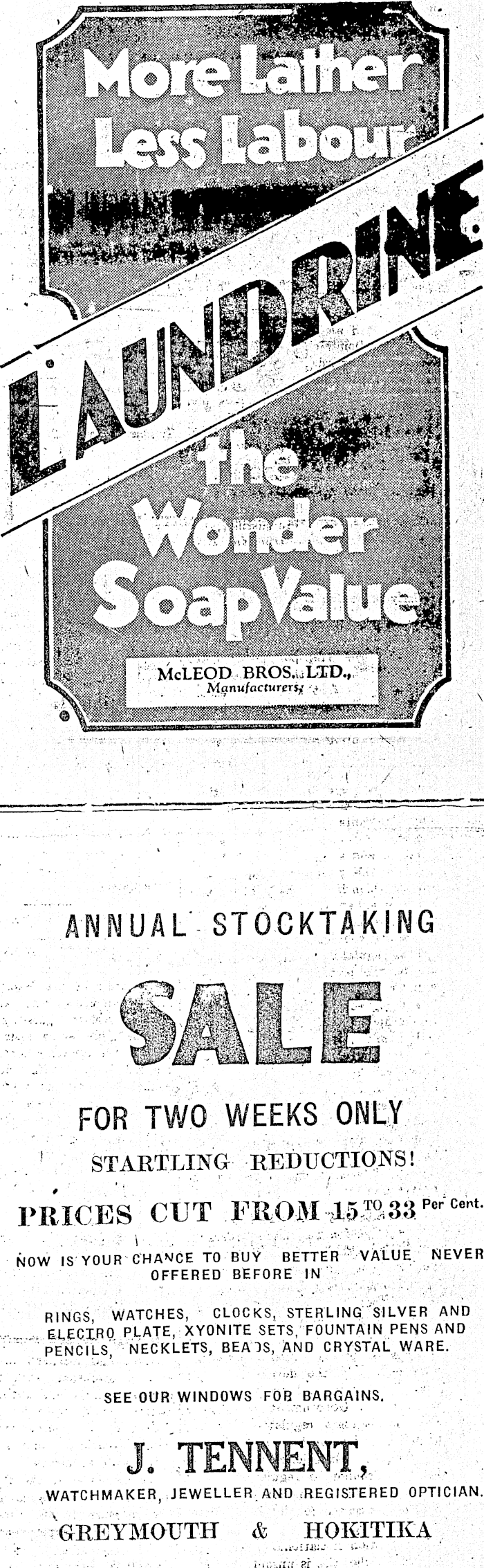 II * t m McLEOD BROS.uLTD > ‘i ANNUAL STOCKTAKING FOR TWO WEEKS ONLY ' STARTLING REDUCTIONS! PRICES CUT FRU> ; MTSB33 p " Ce " 1 - NOW IS YOUR CHANCE TO BUY BETTER VALUE NEVER OFFERED BEFORE IN RINGS WATCHES, CLOCKS, STERLING 'SILVER AND ELECTRO PLATE, XYONITE SETS, FOUNTAIN PENS AND PENCILS, NECKLETS, BEA IS, AND CRYSTAL WARE. SEE OUR WINDOWS FOR BARGAINS. J. TENNENT, • WATCHMAKER, JEWELLER AND REGISTERED OPTICIAN. GREYMOUTH & HOKITIKA niS K