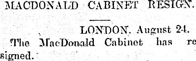 MACDONALD CABINET RESIGN. LONDON. August 24. The MacDonald Cabinet has re signed.