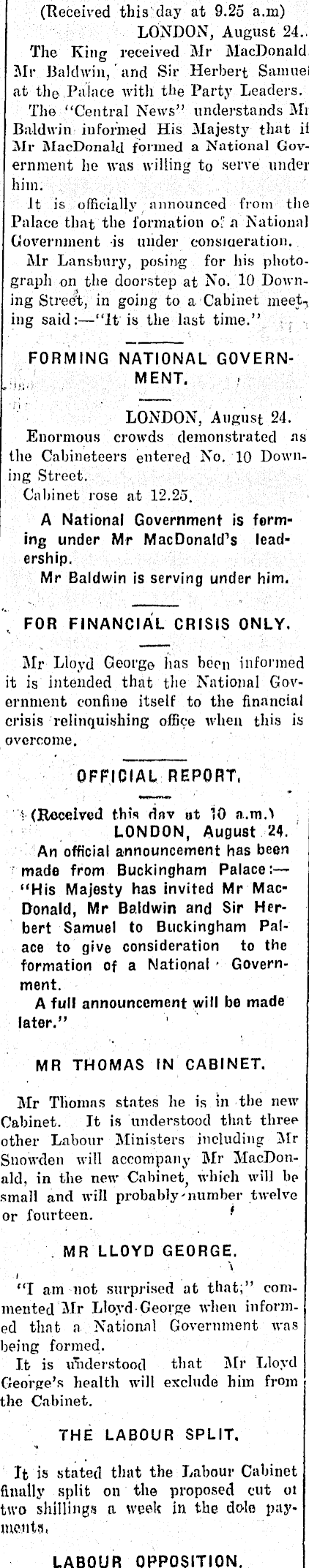 (Received this day at 9.25 a.m) LONDON, August 24. The King received Mr MacDonald, Mr Baldwin, and Sir Herbert Samuel at the Palace with the Party Leaders. The “Central News” understands Mr Baldwin informed His Majesty that if Air MacDonald formed a National Government he was willing to serve under him. It is officially announced from the Palace that the formation of a National Government is under consideration. Mr Lansbury, posing for his photograph on the doorstep at No. 10 Downing Street., in going to a Cabinet meet,., ing said:—“lt is the last time.” FORMING NATIONAL GOVERNMENT. LONDON, August 24. Enormous crowds demonstrated as the Cabineteers entered No. 10 Downing Street. Cabinet rose a,t 12.25. A National Government is forming under Mr MacDonald’s leadership. Mr Baldwin is serving under him. FOR FINANCIAL CRISIS ONLY. Mr Lloyd George has been informed it is intended that the National Government confine itself to the financial crisis relinquishing office when this is overcome. OFFICIAL REPORT, ; (Received this dav at 10 a.m A LONDON, August 24. An official announcement has been made from Buckingham Palace:— “His Majesty has invited Mr MacDonald, Mr Baldwin and Sir Herbert Samuel to Buckingham Palace to give consideration to the formation of a National * Government. A full announcement will be made later.” MR THOMAS IN CABINET. Mr Thomas states lie is in the new Cabinet. It is understood that three other Labour Ministers including Mr Snowden will accompany Mr MacDonald. in the new Cabinet, which will be small and will probably'number twelve or fourteen. ■ MR LLOYD GEORGE. \ “I am not surprised at that;” commented Mr Llovd George when informed that a National Government was being formed. It is understood that Mr Lloyd George’s health will exclude him from the Cabinet. THE LABOUR SPLIT. It is stated that the Labour Cabinet finally split on the proposed cut ot two shillings a week in the dole payments, LABOUR OPPOSITION,