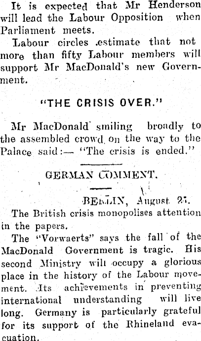 It is expected that Mr Henderson will lead the Labour Opposition when Parliament meets. Labour circles .estimate that not more than fifty Labour members will support Mr MacDonald’s new Government. “THE CRISIS OVER.” Mr MacDonald smiling broadly to the assembled crowd, on the way to the Palace said:— “The crisis is ended.” GERMAN COMMENT. BEr.LIX, -August ?■’. The British crisis monopolises attention in the papers. The ‘‘Vorwaerts’’ says the fall of the MacDonald Government is tragic. Sis second Ministry will occupy a glorious place in the history of the Labour movement. Its achievements in preventing international understanding will live long. Germany is particularly grateful for its support of the Rhineland evacuation.