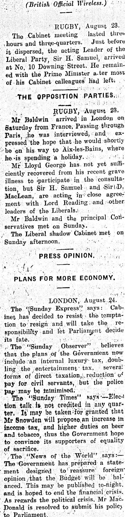 (British Official Wireless.) RUGBY, August 23. The Cabinet meeting lasted three .hours and thrqe-quarters. Just before it dispersed, the acting Leader of the Liberal Party, Sir H. Samuel, arrived at No. 10 Downing Street. He remained with the Prime Minister a.ter most of his Cabinet calleagues had left. THE OPPOSITION PARTIES.. RUGBY, August 23. Mr Baldwin 'arrived in London on Saturday from France. Passing through Paris, /he was interviewed, and expressed the hope that he would shortly -be on his way to Aix-les-Bains, wheie he *is spending a holiday. ' 1 Mr Lloyd George has not yet sufficiently recovered from his recent grave illness to (participate in the consultation, but Sir H. Samuel and 'Sir 1 D • Mac Lean, are in close agreement with Lord Reading and other leaders of the Liberals.! Mr Baldwin and the principal Conservatives met on Sunday. The Liberal shadow Cabinet met on Sunday afternoon. PRESS OPINION. V , ‘ ' J.l / , . ' PLANS FOR MORE ECONOMY. ’■ , t )v ( LONDON, August 34. The ‘.‘Sunday Express’! says: Cabinet has decided to resist the temptation to resign and will take the responsibility and let Parlianjpnt decide its fate. ‘ The ‘‘Sunday Observer” believes that the plans of the Government now 'include an internal luxury tax, doubling the entertainment tax, several forms of direct taxation,: reduction u ; pay for civil servants, but the police pay may be hiinimised. The “Sunday Times" says •—Elec-i tion talk . i». not credited in .any quarter. It 1 may be taken-for granted that Mr Snowden will propose, an increase in income tax, and higher duties on beer k ' and tobacco, thus the Government hope to convince its supporters of equality of sacrifice. 'y . ' , The “News of the 'World" says The Government has, prepared a statement designed to reassure foreignopinion/that the Budget will be balanced. This may be published to-night, and is hoped to end the financial crisis. As regards the political crisis, Mr MacDonald is resolved to submit liis policy to Parliament.