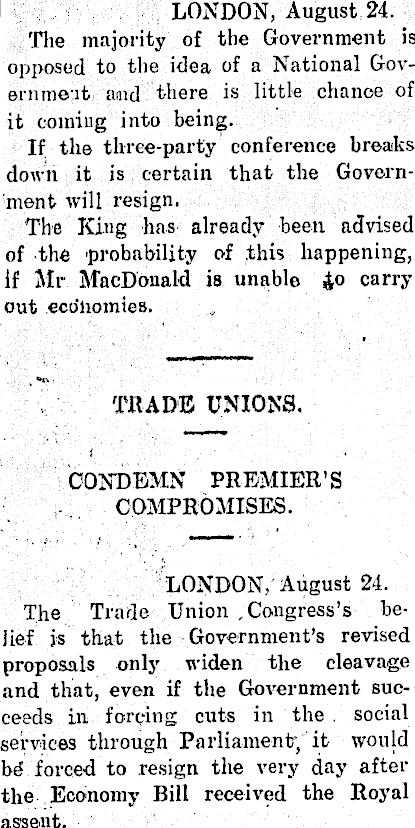 LONDON, August 24. The majority of the Government is opposed to the idea of a National Government and there is little chance of it coining into being. If the three-party conference breaks down it is certain that the Government will resign. The King has already been advised of the probability of .this happening, if Mr MacDonald is unable A 0 carry out economies. TRADE UNIONS. ' ' i . : 1 .• CONDEMN PREMIER’S COMPROMISES. LONDON, August 24. The Trade Union , Congress’s belief is that the Government’s revised proposals only widen the cleavage and that, even if the Government succeeds in forcing cuts in the social services through Parliament, it would be forced to resign the very day after the Economy Bill received the Royal assent.