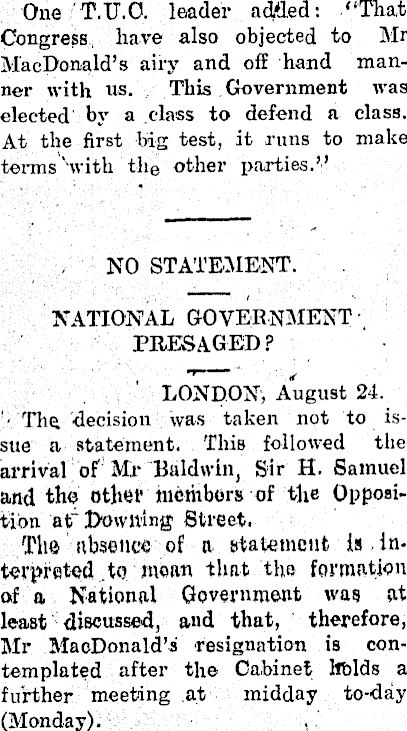 One T.U.O. leader added: “That Congress have also objected to Mr MacDonald’s airy and off hand manner with us. This Government was elected by a class to defend a class. At the first big test, it runs to make terms''with th e other parties." NO STATEMENT. NATIONAL GOVERNMENT PRESAGED P LONDON, August 24. The decision was taken not to issue a statement. This followed the arrival of Mr Baldwin, Sir H. Samuel and the other members of the Opposition at” Downing Street. The absence of a statement is interpreted to moan that the formation of a National Government was at least discussed, and that, therefore, Mr MacDonald’s resignation is contemplated after the Cabinet hblds a further meeting at midday to-day (Monday).