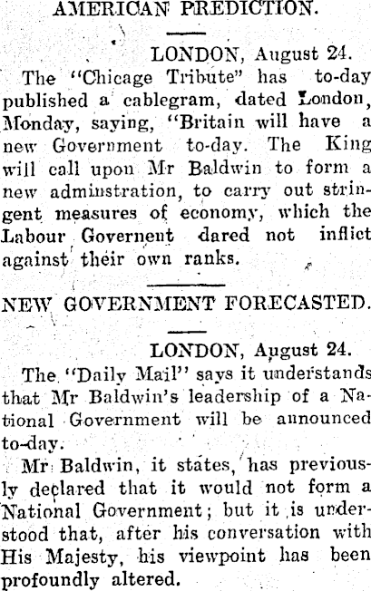 AMERICAN PREDICTION. . * LONDON, August 24. The “Chicage Tribute” has to-day published a cablegram, dated London, Monday, saying, “Britain will have a new Government to-day. The King will call upon Mr Baldwin to form a new adminsfcration, to cany out stringent measures of economy, which the Labour Governent dared not inflict against their own ranks. NEW GOVERNMENT FORECASTED. LONDON, Apgust 24. The “Daily Mail” says it understands that Mr Baldwin’s leadership of a National Government will be announced to-day. Mr Baldwin, it states, has previously declared that it would not form a National Government; but it is understood that, after bis conversation with His Majesty, his viewpoint has been profoundly altered.
