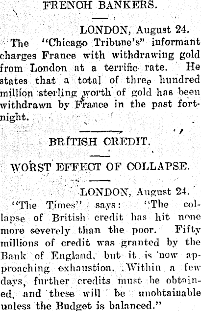 FRENCH BANKERS. LONDON, August 24. The “Chicago Tribune’s” informant charges France with withdrawing gold from London at a terrific rate, He states that a total of tlire e hundred million sterling worth of gold has been withdrawn by France in the past fortnight. . ■ 3- ' > BRITISH CREDIT. WORST EFFECT OF COLLAPSE. LONDON, August 24. “The Times” says: “The collapse of British credit has hit, none more severely than the poor. Fifty millions of credit was granted by the Bank of England, but it. is 'now approaching exhaustion. .Within a few days, further credits must he obtained. and these will l>e unobtainable unless the Budget is balanced.”