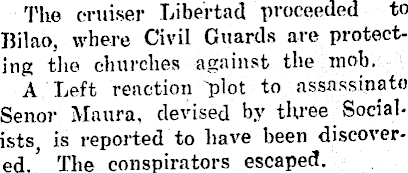 The cruiser Libertad proceeded to Bilao, where Civil Guards are protecting the churches against the mob. A Left reaction plot to assassinate Senor Maura, devised by three Socialists, is reported to have been discovered/ The conspirators escaped.